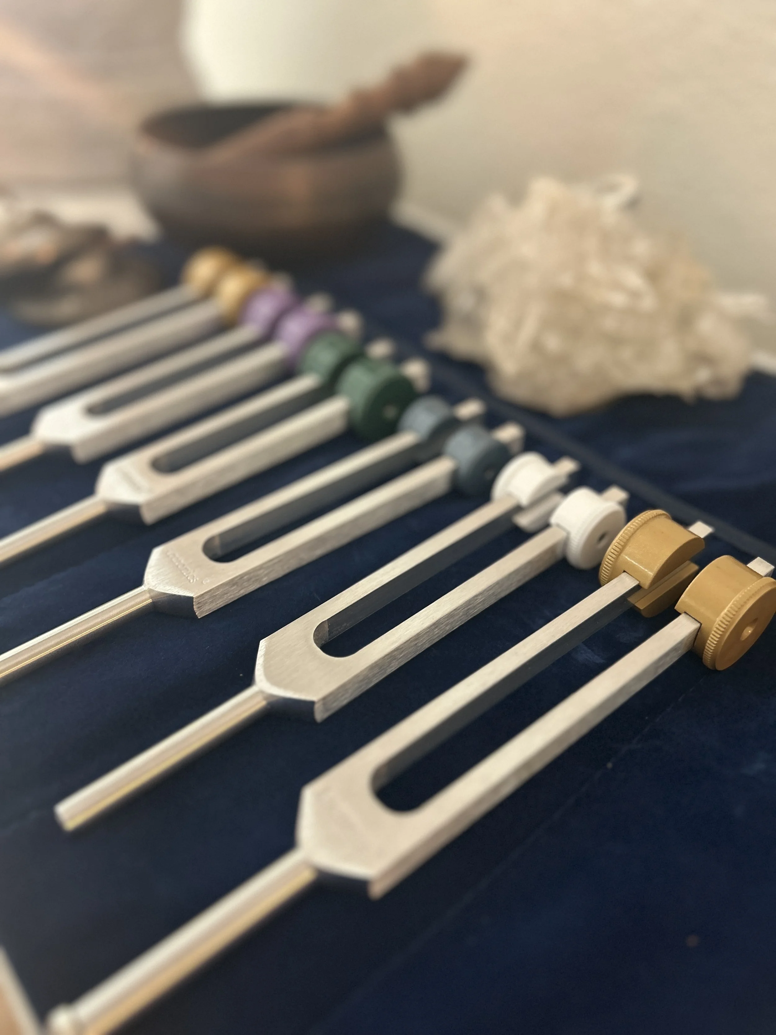 Each session is tailored to the individual based on their specified needs. Precision-calibrated tuning forks are placed on acupuncture and chakra points to awaken and realign the body’s natural energy systems. As sound waves travel through the body, they release tension, restore flow, and invite deep relaxation and clarity.